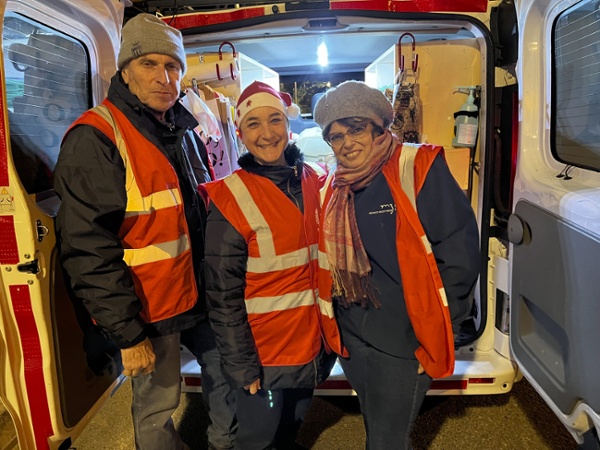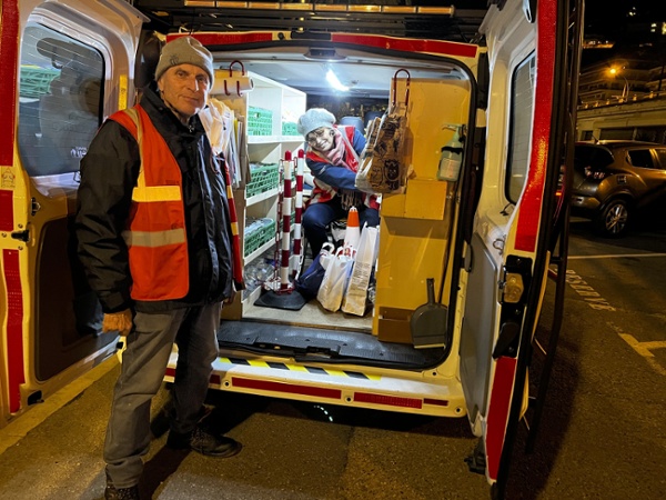Deux véhicules y participent. L’un dédié aux vêtements et aux produits d’hygiène, et le second pour la distribution de « Sacs de vie » et de boissons chaudes.