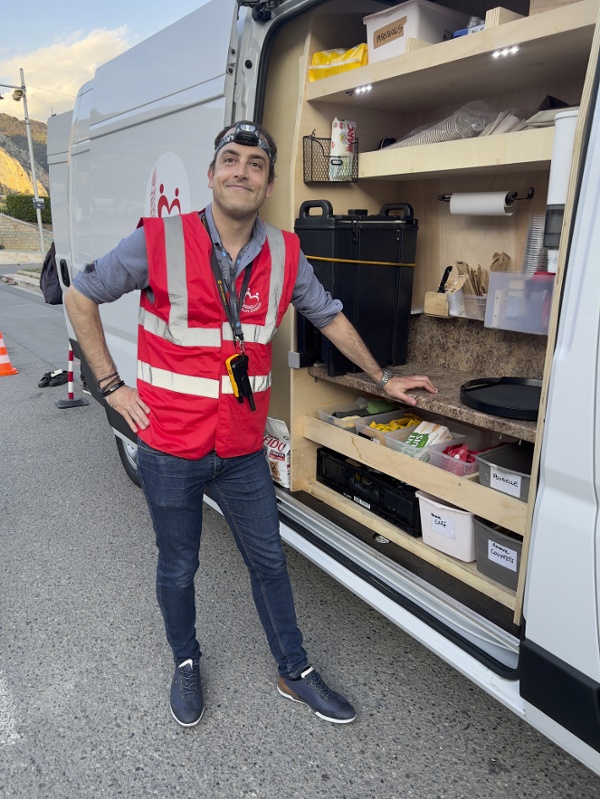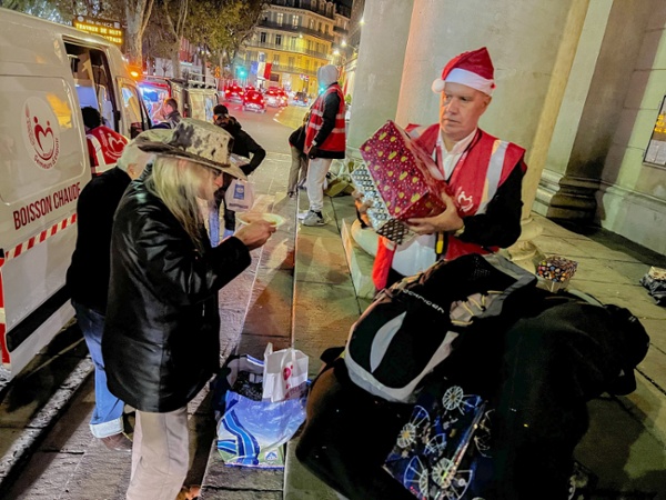 Deux véhicules y participent. L’un dédié aux vêtements et aux produits d’hygiène, et le second pour la distribution de « Sacs de vie » et de boissons chaudes.
